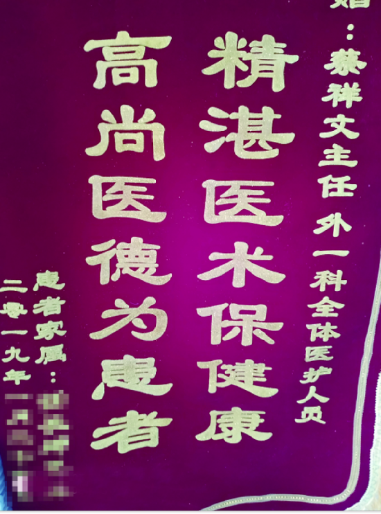 蔡祥文说:“勤学苦练技术只为守护患者生命健康,当患者需要的时候,能够出手相帮。”记得2018年,蔡祥文接诊了一位肠管外露6天的八旬老人。当时老人已先后被两家医院拒绝手术治疗,并下达病危通知书。但老人的儿女们依然不想放弃一丝希望,希望医生能尽力救治。蔡祥文接诊后经过全面评估病情,认为手术成功的几率还是很高的。经过近6个小时的努力,手术非常成功,患者转危为安。患者家属送来一面锦旗表示感谢。蔡祥文说,现在回想起来,对这个手术依然记忆犹新,当时患者已经拖延6天了,肠管发青,部分坏死,再加上患者年龄大,身体综合素质差,手术难度非常大,稍有不慎就下不来手术台。但是好在家属通情达理,全程理解并配合医生。当手术成功那一刻,感觉自己多年的努力和学习就是值得的。