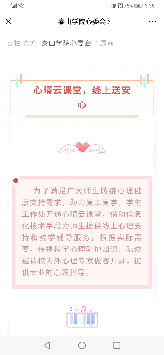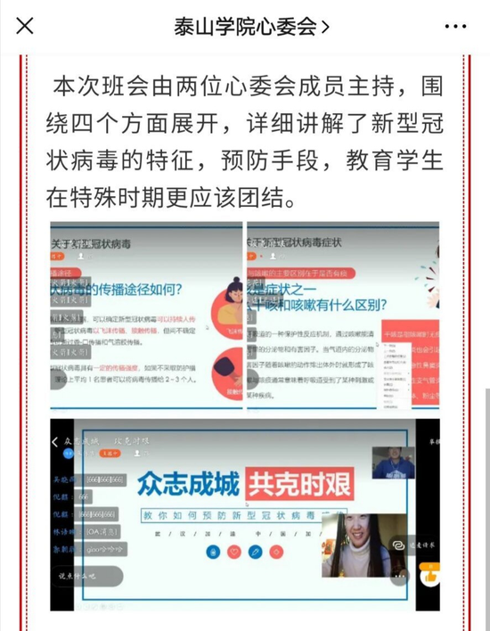 打造学生喜爱的线上心理健康教育平台。“泰山学院心委会”公众号,每天推送“战疫情”心理推文,传播疫情防控知识和情绪与压力管理的相关知识与方法。积极开展线上朋辈心理辅导活动。疫情期间开展了11期战“疫”云班会、心理健康教育学生骨干培训等活动。录制了“中国加油!武汉加油!”的祝福视频。开展“云”家访活动,对心理预警学生进行了及时回访,对学生和家长进行暖心回访和有效的心理指导干预。