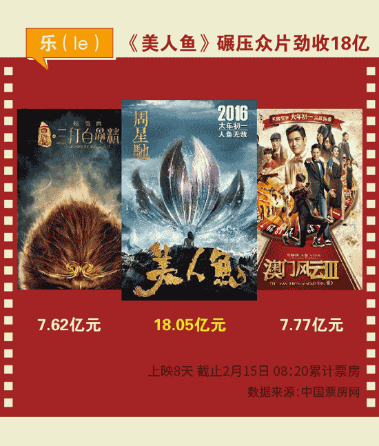 凭着周星驰的金字招牌,电影《美人鱼》自开播起,就开启狂刷票房纪录模式。据中国票房实时统计,截止2016年2月15日北京时间8时20分,《美人鱼》上映8天,累计票房已超18亿,成为眼下春节档的最大赢家。