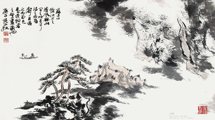 今日之绘画《春来何妙境》是水墨在纸上的游动,色与墨交融,在宣纸上呈现出仙境一般的效果,钓叟乘着一叶孤